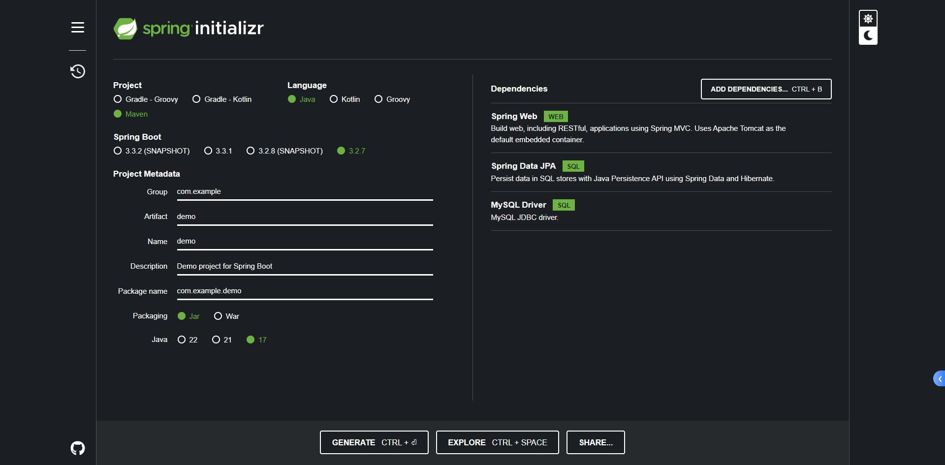 这里选用的 SpringBoot 的版本为 3.2.7,java 版本为 17,项目管理器为 Maven